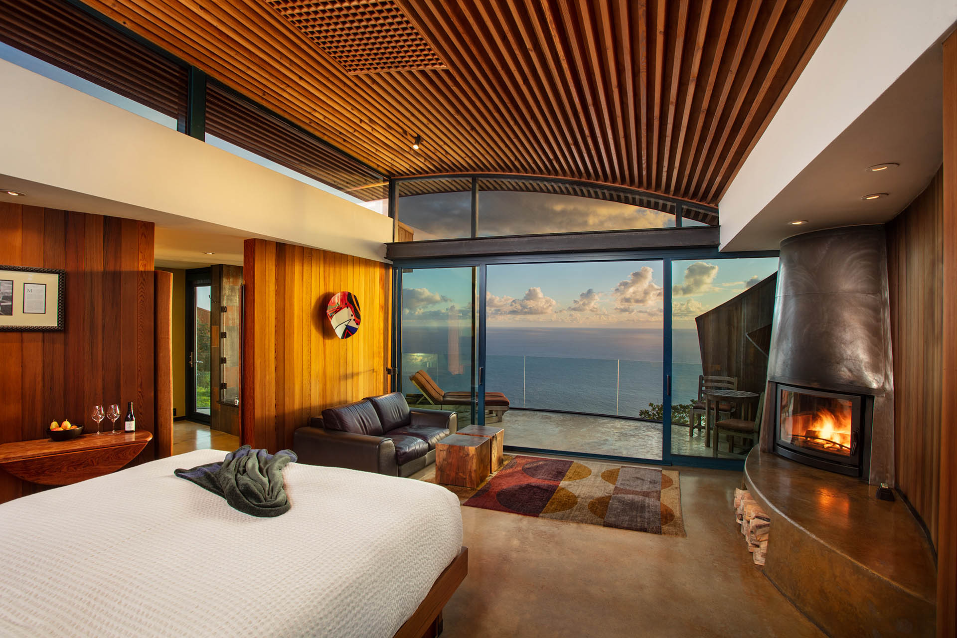 Moreover, the Pacific Suite will make your stay unforgettable. This suite features a unique Pacific Ocean view, private entrances, and custom-built furniture. It also has a wood-burning stove, radiant-heated flooring, and a fireplace.